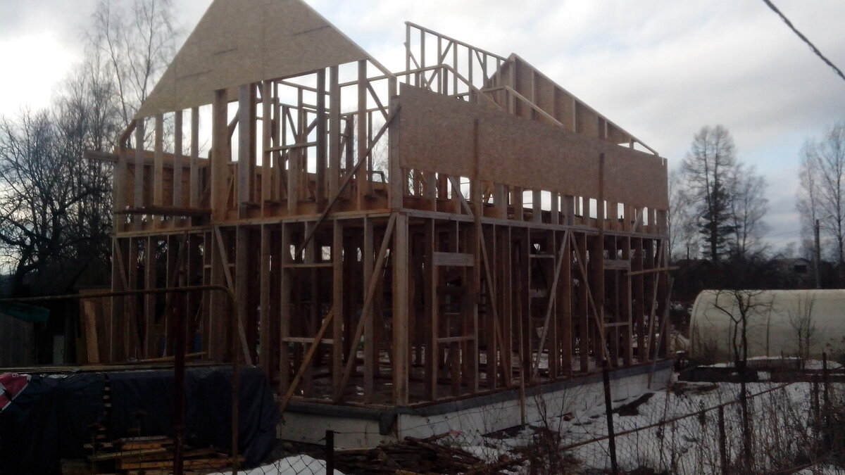 Добрый день! Я продолжаю свой рассказ о строительстве каркасного дома своими руками. В прошлой части я закончил на том, что были построены две боковые стены второго этажа и межэтажные перекрытия. Наступила зима и я свернул все работы. На моей основной работе к новому году я получил неплохую премию поэтому решил не дожидаться весны, а нанять строителей для возведения каркаса второго этажа и крыши. После долгих поисков я наткнулся, на местную бригаду которая была готова выполнить весь требуемый объем работы(каркас 2-го этажа + крыша) за приемлемую для меня сумму. Тут начались проблемы. Первый их заход на объект был в выходные во время моего отсутствия. Они начали с того, что приготовили стропила. Мотивировали это тем, что "100 раз так делали, сейчас стропила выставим, потом каркас соберем". После долгих пререканий с прорабом они великодушно согласились строить по проекту и в удобное мне время. И вот выходные приезжает бригада 4 человека + прораб и начинают сборку фронтона. Ребята соп