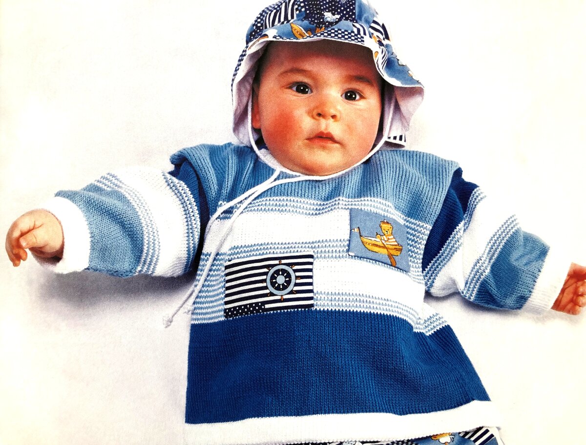 У вашего ребенка с первых дней жизни тяга к воде? В пору связать ему этот джемпер с аппликациями на морскую тематику. Потребуется: Рост 62 — 68 (74 — 80) см. Возраст 4- 8 (10-15) месяцев. Узоры и виды петель Лицевая гладь. 1-й ряд: все петли лицевыми. 2-й ряд: все петли изнаночными; повторять эти 2 ряда. Последовательность чередования полос: * 1 ряд нитью белого цвета, 1 ряд нитью голубого цвета *, повторять от * до *. Плотность вязания 10 х10 см = 30 петель х 40 рядов. Выполнение работы Спинка На спицы № 3 набрать 102 петли нитью белого цвета, вязать 2,5 см лицевой гладью для бейки, 1 ряд — изнаночными петлями (= сгиб), 2,5 см лицевой гладью нитью белого цвета, 9 см (11 см) нитью светло-синего цвета, выполнить 3 раза последовательность чередования полос, после чего разделить петли следующим образом: по правому краю провязать 12 рядов — 48 петель нитью белого цвета и 54 петли, выполнив последовательность чередования полос. Далее вязать 8 рядов на всех петлях, соблюдая последоват