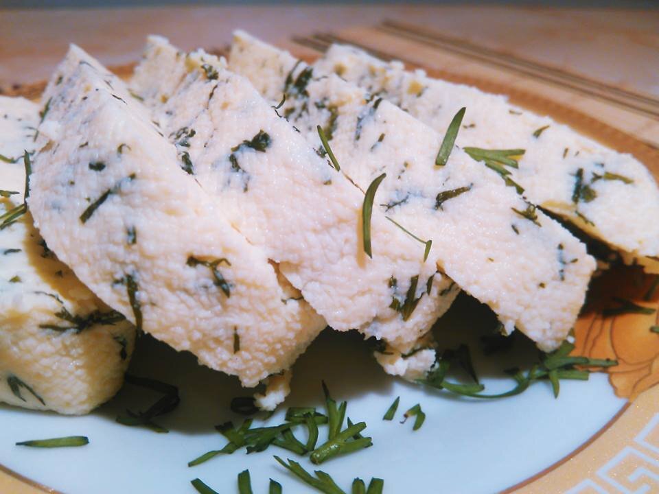 Прованские травы по вкусу (необязательно) или зелень Молоко и кефир наливаем в кастрюлю и доводим до кипения на среднем огне. Тем временем в миске взбиваем яйца со сметаной до однородного состояния. Как только молоко и кефир закипят, вливаем в кастрюлю яйца и сметану. Добавляем соль и прованские травы по вкусу (или зелень). Я кладу 1 столовую ложку трав, но можно и без них. Масса должна покипеть на медленном огне минут 8-10, стать творожистой. Выключаем плиту, даём массе немного остыть и откидываем на марлю. Как только сыворотка стечет, перекладываем сырную массу в какую-нибудь подходящую посуду и ставим сверху гнёт, чтобы сформировался сыр. Как только сыр сформируется и приобретёт нужн