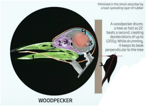 Второй уровень сложности – скрытые свойства. Он означает, что мы может создать аналоги природных механизмов, которые не похожи на оригинал, но с тем же функционалом. Чтобы перейти на этот уровень надо задаться детским вопросом: «болит ли у дятлов голова?». Они стучат по дереву 22 раза в секунду, 12000 раз в день своей головой. Один удар дятла создает перегрузку в 1200 G, чтобы Вы понимали, при 5 G я терял сознание, а самая сильная перегрузка, которую когда-то испытывал человек составляет всего 214 G. Она длилась мгновение, но дорого обошлась гонщику Кени Браку, множественные переломы, травмы позвоночника и 18 месяцев реабилитации. Но дятлу, кажется, на физику плевать, он долбит себе и долбит. На самом деле физику не обмануть, и у дятла есть 4 механизма, которые помогают ему не умереть от таких перегрузок. 1) Жесткий, но при этом эластичный клюв. 2) Пористый череп. 3) Маленький отсек с жидкостью, которая гасит удары. 4) Пружинящая кость, которая поддерживает язык. Инженеры смогли во