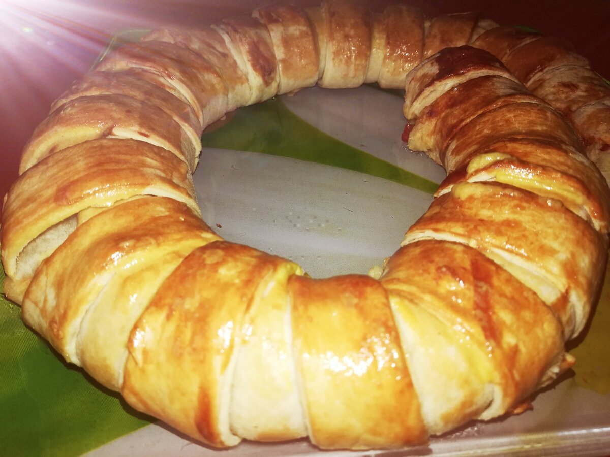 Если вы любите пиццу это блюдо вам тоже должно понравиться. На вид пицца-калач выглядит ну очень вкусным. При разрезе горячего пирога из него аппетитно тянется плавленный сыр. Ингредиенты: Тесто слоено-дрожжевое 400 гр Сосиски -2 шт Помидоры -1 шт (можно черри, но тогда больше) Майонез - 3 чайные ложки Кетчуп - 3 чайные ложки Сыр - 100 гр Специи по вкусу У меня упаковка слоеного теста 500 гр, в ней пластины. Автор видео с ютуба, чьим рецептом я воспользовалась, сказал, что тесто немного не пропеклось, поэтому, я отрезала от пластов в общей сложности 100 гр. 1. 2 пластины соединяем, раскатываем в очень длинный прямоугольник. 2. С одной стороны нарезаем полоски, примерно на треть пластины (у меня слишком длинные, из за этого немного вытек сыр). После этого желательно положить под тесто пергаментную бумагу, или коврик для выпекания. Так как без этого будет сложно уложить пирог на противень (у меня просто ничего не было, пришлось подправить пирог на противне). 3. Смазываем тесто смесью к