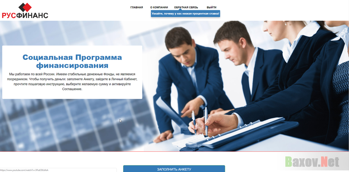 Мошеннический "РусФинанс" позиционирует себя денежным фондом, который вас всегда выручит. Вам предлагается взять кредит на любые нужды от 4% до 10% годовых на срок от 3 лет до 20 лет.