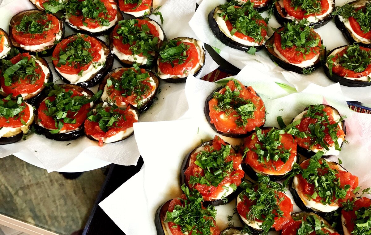 Каржый обжаренный кружочек баклажана помажем небольшим количеством чеснока, затем намажем небольшое количество майонеза, а на майонез выложим кружочек помидора, сверху посыпем мелко нарезанной зеленью.