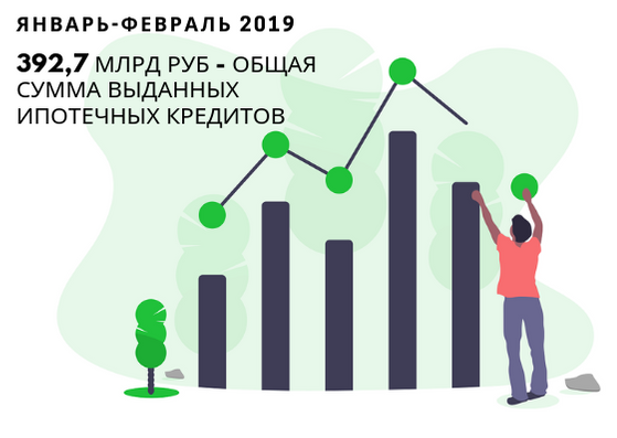 Объем жилищного кредитования увеличивается, несмотря на возрастание ипотечной ставки. Согласно материалам Центрального Банка России в январе-феврале 2019 года общая сумма жилищных кредитов, выданная банками, составила 392,7 млрд. рублей, что на 13,1% больше, чем за первые два месяца 2018 года (347,2 млрд. рублей).