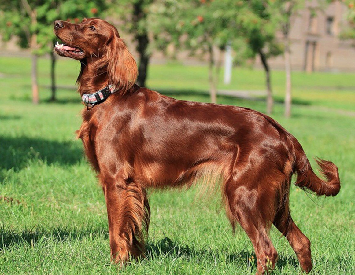 Ирландский сеттер сформировался как обособленная порода после разделения сеттеров по окрасу, примерно около середины прошлого века из красно-пегих сеттеров, разводившихся, главным образом, в Ирландии. Путем отбора преимущественно красных собак был выведен сеттер сплошного красного окраса, какого мы знаем в настоящее время. Это элегантная собака с благородными линиями и хорошо развитыми охотничьими качествами, которые не утратили свою силу несмотря на то, что ирландские сеттеры из-за их красоты и элегантности часто были оторваны от охоты, являясь просто изысканной, модной собакой. Исключительно сильно развитый охотничий инстинкт у этих собак, бывает причиной того, что у них затрудняется подзывистость. Но если путем последовательной дрессировки ирландского сеттера удается хорошо держать в руках, то тогда из него получается замечательная охотничья собака, которую можно использовать для универсальной работы, в особенности благодаря его врожденной любви и постоянной готовности работать в воде и апортировать.