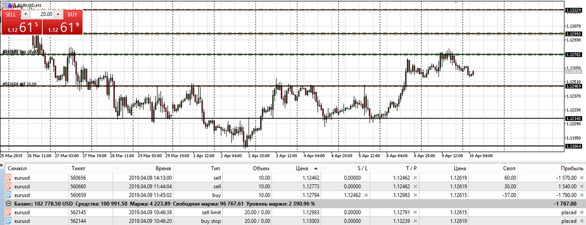 Вчера у меня были открыты ордера и сегодня я ждала пока цена опустится до нужного мне нижнего уровня. Но я увидела, что цена разворачивается и идет вверх, конечно можно ждать еще, но я решила закрыть с профитом, который уже итак есть и выставить новые отложенные ордера. Закрыла я все сделки в +883,27$, и подкорректировала линии поддержки и сопротивления: Занесла все значения линий в свой файл в Excele: И наставила отложенных ордеров: Будем ждать, что будет дальше.