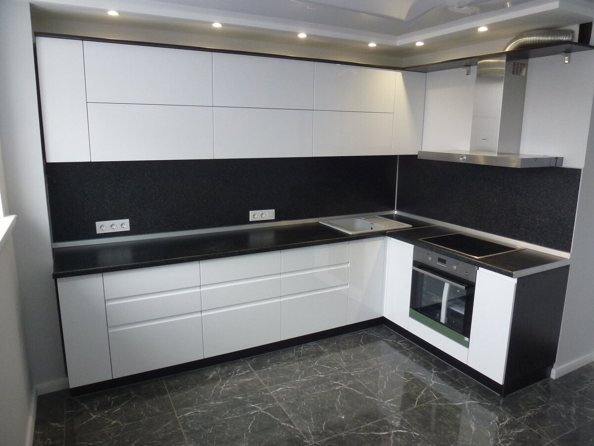 Кухню делали в обычном стиле, сам гарнитур белый с черной столешницей из МДФ с пленкой глянцевой, и под стиль столешницы сделали так же черный фартук, получается очень контрастно, и уютно.