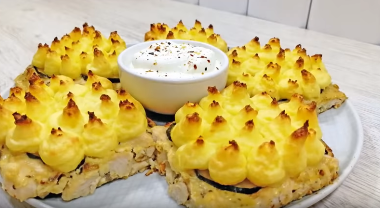 Потрясающее горячее блюдо, которое не только порадует своими вкусовыми качествами но и украсит ваш праздничный стол. Готовим... Продукты: Куриное филе - 600 грамм Лук - 1 штука Шампиньоны - 200 грамм Сметана - 100-150 грамм Яйца - 2 штуки Горчица - 2 столовые ложки Крахмал - 2 столовые ложки Соль, перец Картофель -600-700 грамм Сметана или сливочное масло - 80 грамм Яйцо - 1 штука Сыр - 60 - 70 грамм Маринованные огурцы - по желанию Лук и грибы мелко нарезать. Лук отправить на сковороду, обжарить до мягкости несколько минут. Далее, добавить грибы, готовить пока не выпариться вся жидкость. Потом еще пару минут до легкой румяности и посолить. Куриное филе нарезать мелкими кубиками. Смешать с грибами и луком. В емкость отправить сметану, горчицу, яйца, соль, перец и крахмал. Хорошо перемешать. Далее к куриным кусочкам с грибами добавить заправку из сметаны. Перемешать и убрать в холодильник минимум на 1 час. Картофель отварить до полной готовности в подсоленой воде. Горячий картофель р