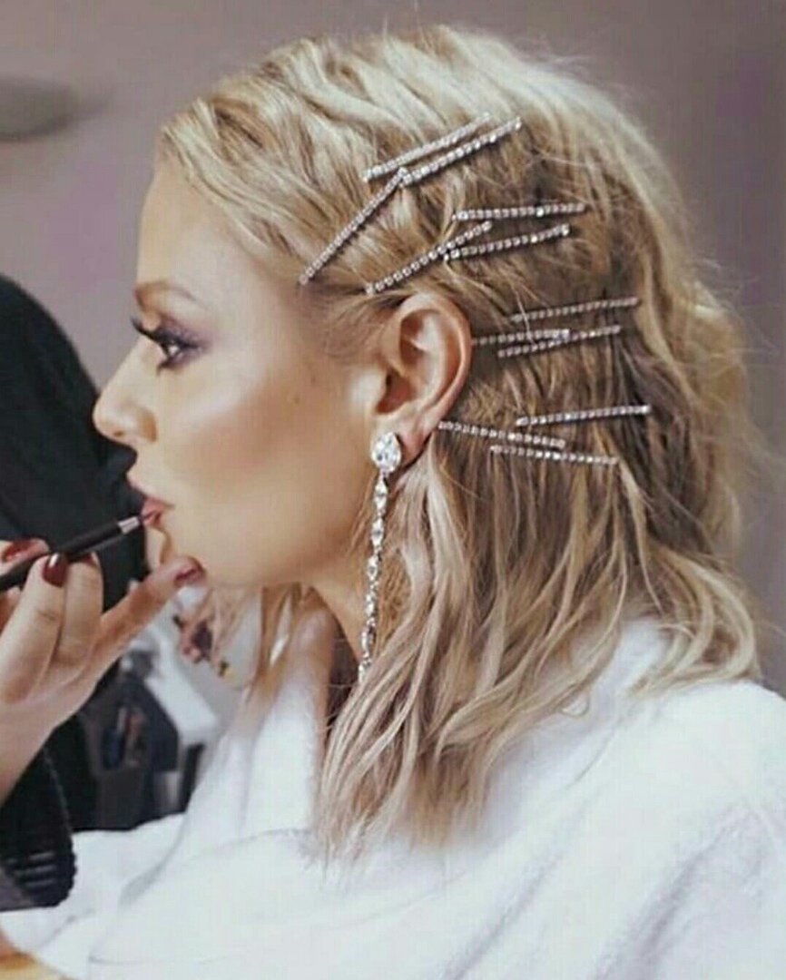 Заколки с жемчугом, обычные невидимки, со стразами, с надписями, сюда же можно отнести резинки с бантами, платки, ободки. Подойдёт для небрежной косы, хвоста или пучка, так же ими можно оформить пляжные локоны, как на длинных волосах, так и на каре или короткой стрижке. Можно оформить одну сторону, можно хаотично, включаем фантазию и встречаем теплый сезон.