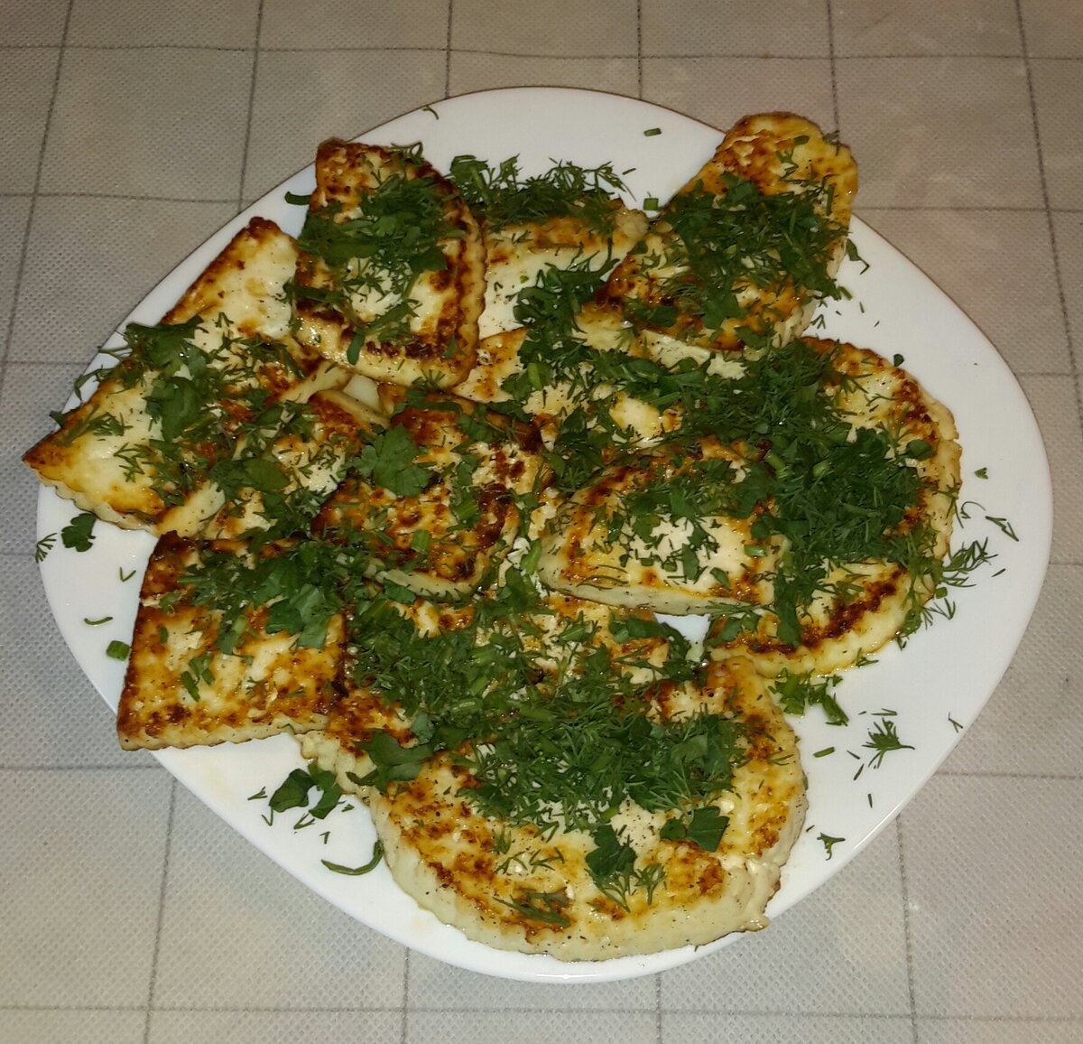 Такой завтрак научила меня делать соседка , которая раньше жила на Кавказе. Доводилось пробовать жареный сыр тофу, но не впечатлило. необходимо: Режем сыр на куски толщиной 1-1.5 см, и так чтобы его легко было переворачивать лопаткой, не очень крупными ломтиками. На сковороде топим масло сливочное и доводим его до кипения. Масла не очень много, иначе сыр не зажарится. Выкладываем ломтики сыра. Если сыр пресный хорошо солим его. Если в меру, то немного. Перчим. Обжариваем до золотистой корочки и переворачиваем лопаткой. Вновь солим и перчим. Обжариваем и со второй стороны до золотистой корочки. Сыр готов. Посыпаем рубленной зеленью. Подаем с овощами и соусом ткемале или чили. Хорошо к такому завтраку любой кисломолочный напиток. Айран, тан или кефир. Можно и к чаю. Два-три кусочка такого сыра вполне достаточно для завтрака. Приятного аппетита!