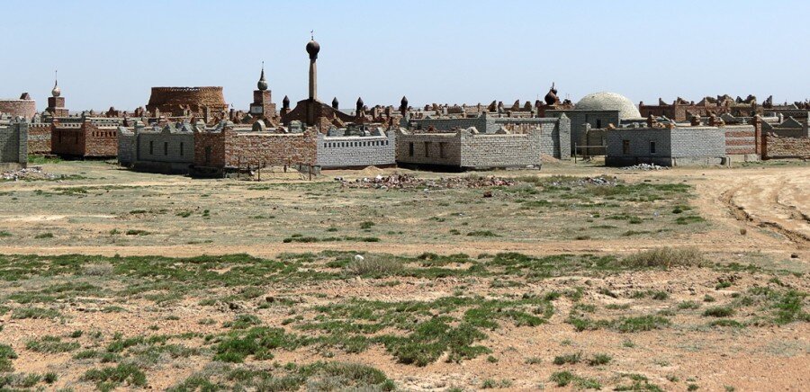 На карте весь путь пролегал по федеральной трассе. И я поехал... С Балхаша до Каркаралинска дорога была просто идеальной, после асфальт стал хуже, а затем и совсем сменился на грейдер из крупного гравия. Оказалось там на самосвалах возят с карьера породу. И такая дорога продолжалась не одну сотню километров.На протяжении этого пути не попадалось ни одного населённого пункта. Поверьте, приходили разные мысли, но я с упорством продолжал двигаться вперёд... После Каркаралинска, проезжая населённый пункт Буркитты, я вдруг увидел у дороги необычные казахские могилы. Сколько я не ездил по Казахстану за свою жизнь, но таких могил-некрополей ( старых, больших, сооружённых из самана) никогда не встречал. Эти два некрополя находились отдельно от всего кладбища, на другой стороне дороги.