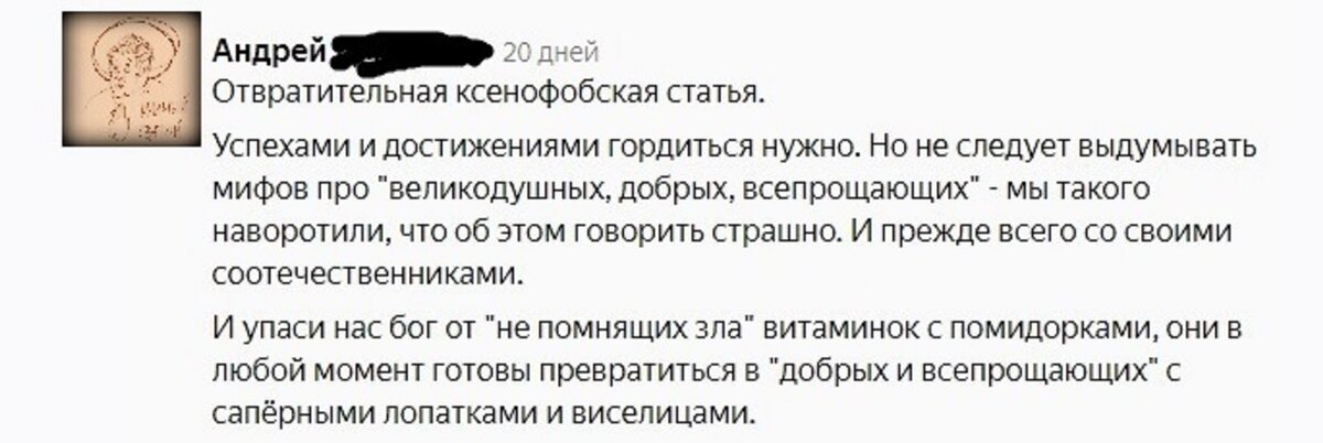 Меня не покидают смутные сомнения, что самое интересное в публикациях – это комментарии. Часто нет желания читать статьи, но комментарии - всегда. Такие словеса завешивают некоторые уникумы, что любо-дорого посмотреть. Политически окрашенные комменты самые задорные, самые эмоциональные, самые дорогие сердцу читателя. Впрочем, те к кому они обращены не очень рады живому, богатому русскому языку. Бывает. Одни молотят то, что на ум пришло, другие – стесняются, а третьих - бабушки научили думать о людях хорошо, поэтому всему рады. И, конечно, самые занимательные - это вруны на оплате, так сказать тролли интернета. Вот скрин, полюбуйтесь: Этот Андрей попутал подвиги своих соратников с либерально-ненавистнической идеологией и наши подвиги по восстановлению страны, по неприятию гомосексуализма, по отторжению власти злобного олигархата, по сопротивлению колониальным замашкам госдеповских сявок. Сколько хороших людей погубили трусы, лжецы, болтуны со своей принципиальной либеральной пози