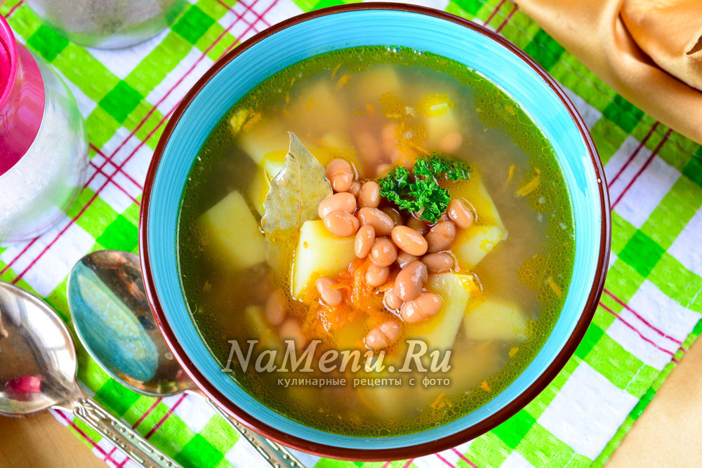 Необходимые продукты на 2,5 л. воды: - 200 гр. консервированной фасоли в томатной заливке, - 150 гр. картошки, - 1 средняя луковица, - 1 морковка, - 1 долька чеснока, - 1 сушеный лавровый листик, - 30 гр. постного масла, - соль по вкусу. 💧В кипящую воду добавляем картошку нарезанную на средние брусочки. Варим 15 мин., солим 🥕Морковку натираем на терке, лук и чеснок измельчаем 🔥Жарим на постном масле овощи и отправляем в суп, варим на маленьком огне 🥄Когда картошка сварится, добавляем фасоль вместе с томатной заливкой 🍂Кладем в суп лавровый лист, варим 5 мин., выключаем. Прикрываем крышкой и даем настояться 20 мин. https://namenu.ru/10563/Postnyj_fasolevyj_sup_iz_konservirovannoj_fasoli/