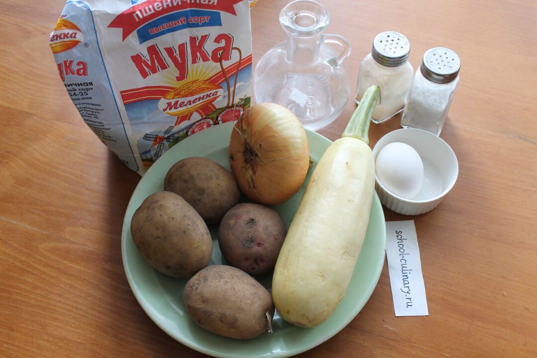 Картофель, кабачки и репчатый лук очищаем и моем.