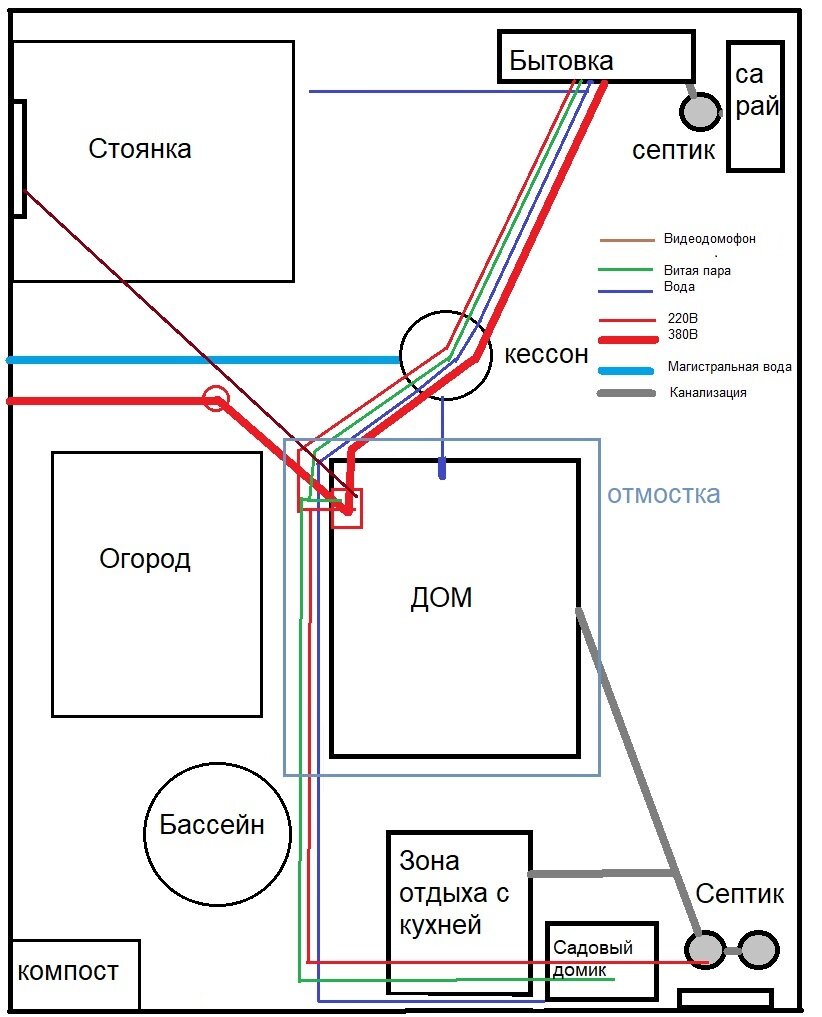 2. Вода. Общественная вода приходит в кессон, откуда идет ввод "зимней" воды в дом на глубине 1 м., а так же идет ответвление воды в сторону бытовки и в сторону "зоны отдыха с кухней". Оттуда же планируется сделать ввод воды на огород и бассейн.