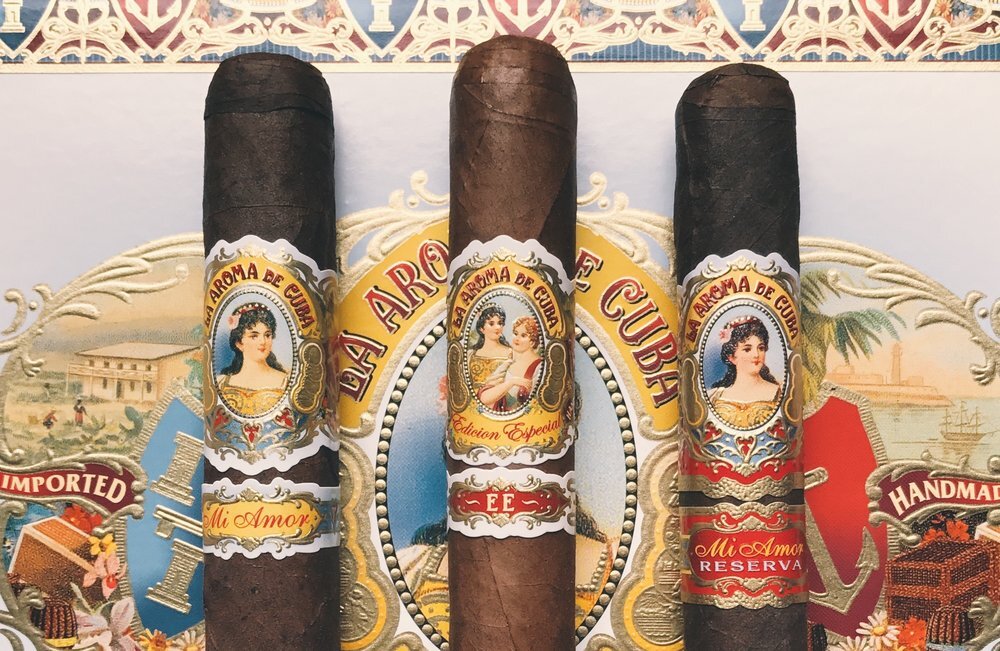 Впервые этот бренд вышел на рынок в 2003 году, однако уже через три года он был переработан маэстро Хосе Гарсия и родился заново и в новом обличии, а именно с покровом из широколистного Connecticut broadleaf и только никарагуанскими табаками внутри. La Aroma de Cuba Mi Amor Belicoso (Figurado, 5 1/2" х 54, примерная стоимость $ 7.75). Аккуратная и элегантная сигара с потрясающим букетом, наполненным оттенками ореха, кедра, цитрусовой цедры и уравновешенный нотами сладкой нуги. Сигара исключительного качества! La Aroma de Cuba Mi Amor Magnifico (Corona Gorda, 6" х 52, примерная стоимость $ 7.50). Отличная сигара наполненная до краёв превосходным букетом из нот жареных кофейных зёрен и чёрного перца, очень удачно уравновешенных оттенками сладкой ванили, цитрусовой цедры и какао. La Aroma de Cuba Mi Amor Reserva Maximo (Corona Gorda, 5 1/2" х 54, примерная стоимость $ 9.25). Сделанный из аналогичной, но не идентичной смеси с традиционной линией Mi Amor, Maximo приобретает более мощный ар