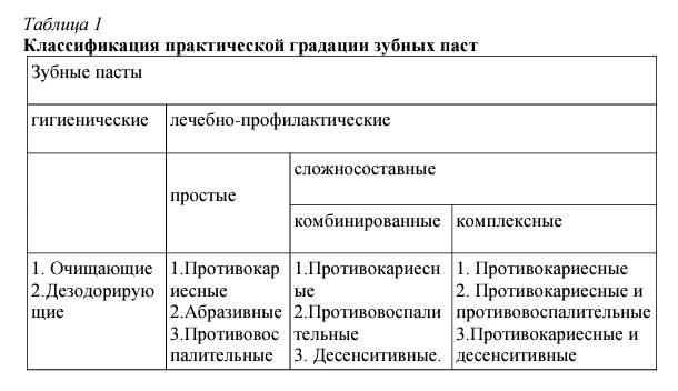 Наиболее существенна градация зубных паст по назначению (табл. 1), в соответствии с ним все зубные пасты подразделяются на две основные группы: гигиенические и лечебно-профилактические.