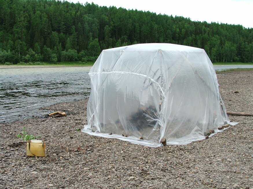 Пока горит топка, огнём можно не только греть камни, но и приготовить ужин. Одновременно делаем каркас для бани из тонких жердей, с которых нужно тщательно стесать все выступы - веточки, чтобы не повредить материал навеса. Сам "домик", заранее делаем в спокойных домашних условиях из полиэтиленовой плёнки. Будет хорошо, если вшить молнию для входа, но можно делать и одноразовый вариант, без замков.