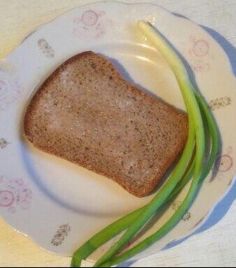Черный хлеб с солью Самой простой разновидностью этого бутерброда был кусок черного хлеба, посыпанный солью. А дальше можно было идти по пути усложнения - хлеб перед посолкой мазался маслом (подсолнечным или сливочным, в зависимости от содержимого холодильника и предпочтений), корочка натиралась чесноком, или, как на картинке, получившееся лакомство заедалось молодым луком. Белый хлеб с сахаром Делался примерно так же, как и предыдущее лакомство, только масло, если оно использовалось, было сливочным, а сверху бутерброд посыпали сахаром. "Домашнее пирожное" Существовало две разновидности "домашних пирожных.