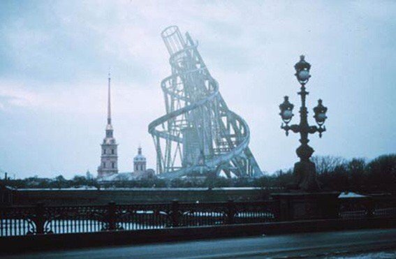 Теперь к реальности. В СССР был проект по создаю башни Татлина. Дело в том, что Владимир Татлин в 1919 году придумал символ для коммунизма, это была башня из железа, стали и стекла, которая всем своим видом презентовала бы веру в будущее. Какого размера? 400 метров! Вот такие были планы. Проект представлял собой нечто из наклоненных спиралей металла, которые связаны между собой. Теперь макет хранится в Третьяковской галерее, а саму башню из космоса не видно.