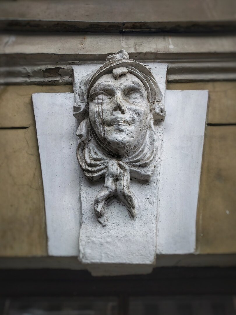 Но добило не всё это, а попытка реставрации маскарона в стиле ЖЭК-арт. Ну, то есть, я не уверена, что это именно реставрация, ещё рабочие гипотезы - инсталляция "Музея гигиены" о вреде сифилиса или нативная реклама какого-нибудь похоронного агентства в стиле "Memento mori".