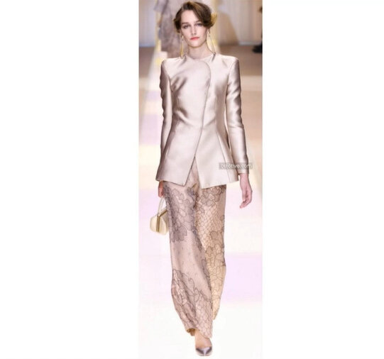 Домов моды очень много и у каждого из них свой почерк, своя эстетика. Например, дом моды Армани провозглашает женственность, элегантность. А еще мы видим любовь к брючным комплектам, но брюки имеют плавную линию кроя - мягкие, струящиеся. А вот жакеты нередко блестящие и прохладные по тону. Попробуем создать комплект в духе дома Armani. Мы привнесем в комплект нужное настроение за счет шелкового топа, гладкой шалевой линии ворота жакета и брюк на мягких защипах. Женственные лодочки и золотистый клатч тоже отвечают эстетике дома. Важно понимать, что речь идет не о копировании подиумного образа, а о том, что знакомясь с коллекциями модных домов, мы начинаем понимать их почерк, ценности, формы, цвета, фактуры. И это понимание позволяет свободно создавать комплекты в духе самых разных домов моды. Уловить ДНК дома не так-то просто. Для этого нужно просмотреть и проанализировать много коллекций и постараться найти в них повторяющиеся компоненты и понять их. Вот, к примеру, в доме Valentin