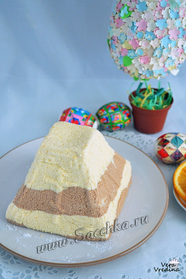 Шоколадная творожная пасха приготовлена с абрикосовым конфитюром. По вкусу можно брать любые фруктовые или ягодные джемы и варенья. Ингредиенты: Как приготовить: P.S.: На заднем плане - пасхальное дерево, сделанное своими руками.
