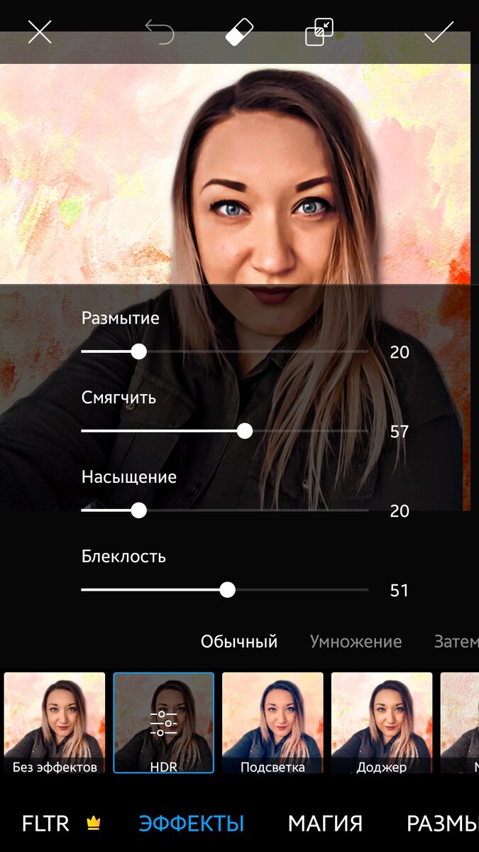 1. Первый шаг - создаём стикер себя -добавляем вашу фотографию в PicsArt. Отмечу, что фото должно быть хорошего качества. И при необходимости с нужными вам коректировками света, цвета, кожи и т.д. - выбираем "Инструменты" ➡️ своб. выделение➡️ значок человечка👤 внизу. Автоматически PicsArt определит лицо и тело, при помощи Кисти выделяем что не определила программа, Ластиком - Убираем лишнее ➡️нажимаем далее (в правом верхнем углу). Ваш стикер сохранён ✔️ 2. Создаём заготовку -открываем белый или цветной фон. Его можно выбрать в PicsArt или скачать в любом поисковике (яндекс, Google, Pinterest и т.д) - Добавляем себя, заходим во вкладку "Стикеры"➡️"Мои стикеры" и выбираем тот, что создали в первом шаге (себя) . Располагаем на фоне как нам нравится, ластиком убираем лишнее. 👍 3. Добавляем эффект рисунка Выбираем "Эффекты" на нижней понели ➡️вкладка "Эффекты" ➡️HDR, регулируем ползунки по своему вкусу. У меня так : Сохраняем ✔️ Еще раз заходим в Эффекты ➡️вкладка "Арт" ➡️Маслян