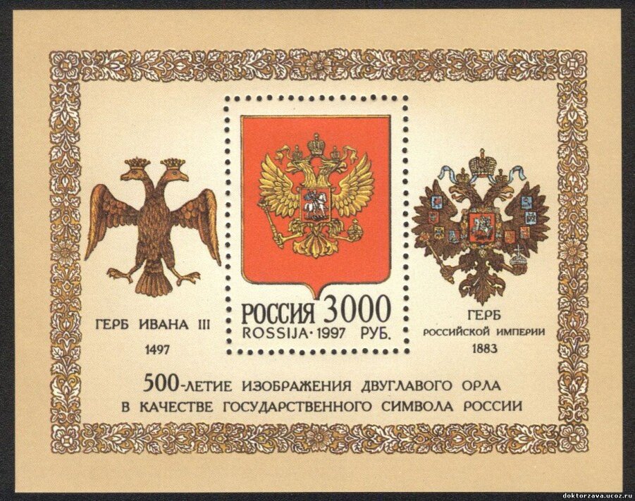 В России, как и во многих странах Европы, государственные гербовые эмблемы появились в эпоху средневековья. В 1497 году двуглавый орел в качестве государственной эмблемы впервые появился на печати Ивана III, причем совместно с изображением святого Георгия, некогда являвшегося покровителем киевских князей.