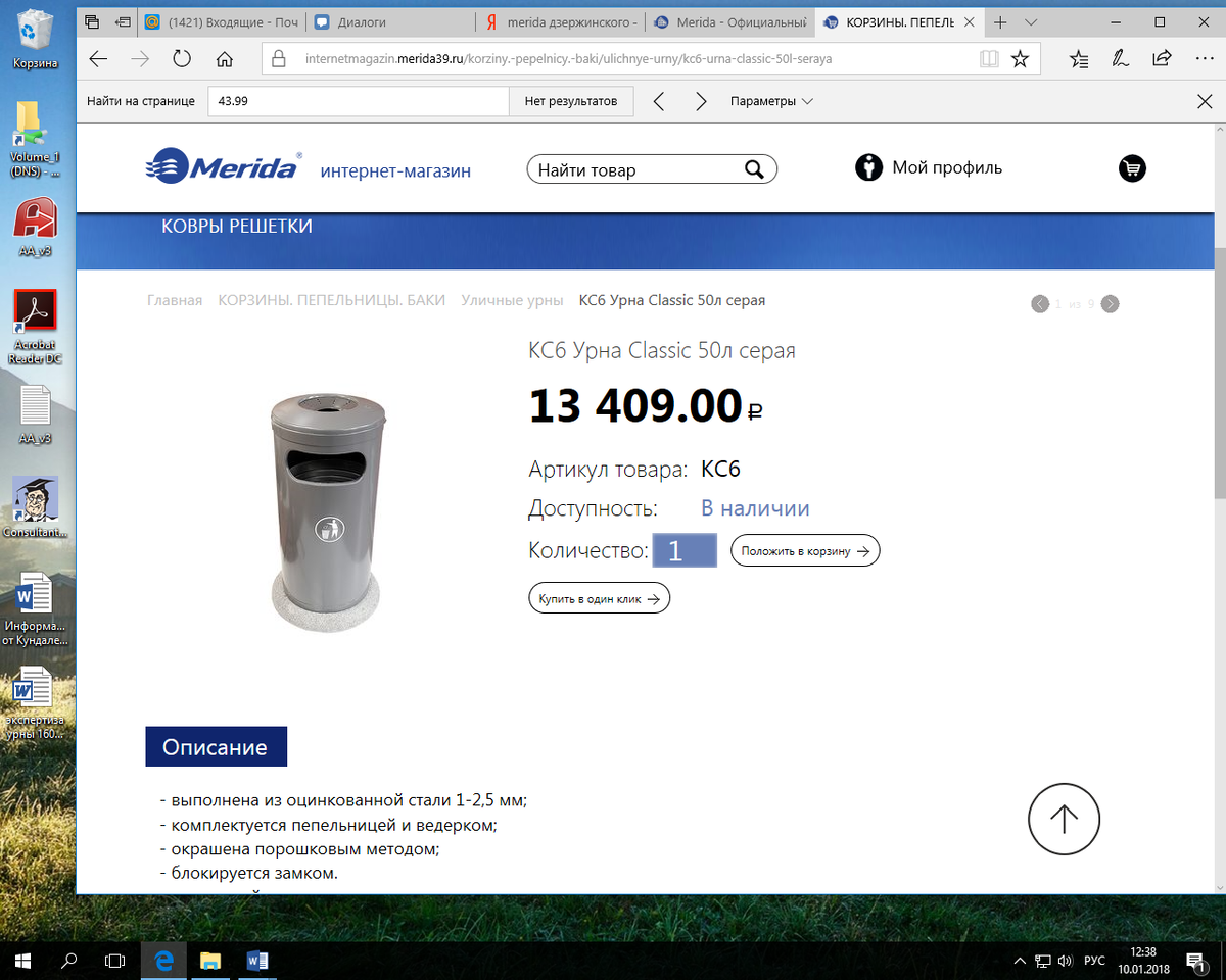 15,2 тысячи рублей — таковая средняя стоимость одной антивандальной урны, которые намерена закупить администрация Калининграда в количестве 133 штук — на 2 миллиона рублей. Техническое задание, опубликованное в рамках документации на сайте госзакупок, говорит о том, что каждая урна должна вмещать порядка 50 литров мусора. Толщина стенки корпуса — 1,2 мм, крышки — 2 мм. Урна закрывается на ключ. Укомплектована пепельницей. Имеет бетонное основание. Бетонное основание и корпус урны должны быть закреплены в антивандальном исполнении, т.е. крепление бетонного основания к корпусу урны должно быть затянуто 3-мя болтами диаметром не менее 6мм и обжато гайками. Габаритные размеры: высота 89 см, ширина 50 см. Емкость 50 литров. Масса урны 50 кг. Общая сумма контракта 2033900 рублей. Стоит отметить, в документации к конкурсу размещён снимок урны, которую администрация Калининграда хотела бы закупить. Оказалось, что он урезан и является скриншотом сайта одного из местных интернет-магазинов, где и