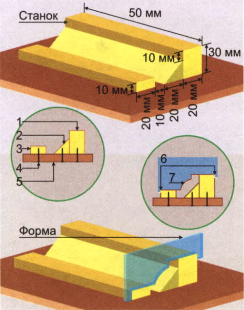 Декорирование гипсовой лепниной постепенно возрождается и становится все более популярным при отделке квартир. Можно купить готовую, отлить в формах или изготовить самостоятельно — последнее и рассмотрим. По прежде отметим, что в качестве заполнителя вполне подойдут смеси из гипса, алебастра и даже штукатурки под финишную отделку. Инструменты для работы: шпатель, наждачная бумага, дрель, шуруповерт. Декор потолка гипсовой лепниной своими руками Сооружаем импровизированный станок из реек 10x20 мм (3), 20x30 мм (1) и одной треугольного сечения 20x20 мм (2). Они должны крепиться к основанию (5) с тыльной стороны на саморезы (4), быть окрашены и отшлифованы, чтобы к ним не приставала смесь. Вырезаем форму из пластмассы (оргстекла) толщиной 3 мм. Обращаем внимание на выпуски-ограничители (6), которые позволяют вести форму ровно по линии, а также на фигурный вырез (7), стачиваемый под углом 30°. Вырезаем две заглушки по форме фигурного выреза и закрепляем их на торцах. Дно станка заранее за
