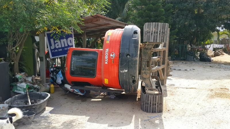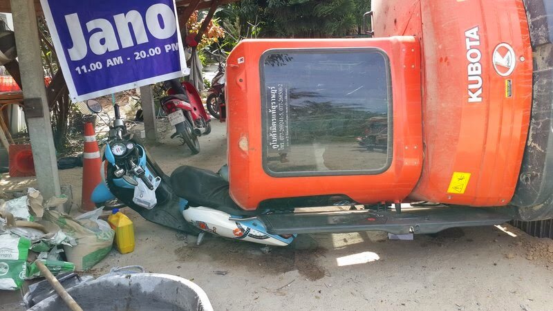 Как это произошло я не видел, но результат падения копательной машины на скутер увидел и сфотал.