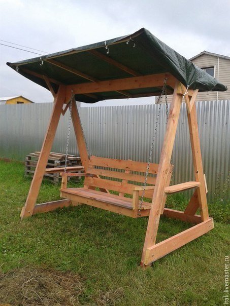 Дачные качели с навесом своими руками Небольшой фотоотчет по изготовлению качелей на дачу. Начнаем с изготовления каркаса подвесной скамьи. Общий вид основной рамки. Крепим стойки будушей спинки. Процесс изготовления опор для подвесной качели. Оставляем паз для основной несущей перекладины из доски. Примеряем, что у нас получилось. Подвешиваем скамью и изготавливаем каркас для навеса. Крепление цепей на вворачиваемые крючки. Готовое изделие. Получились качели не хуже покупных! Если вам понравилась статья то ставьте свои лайки и нажимайте палец вверх и конечно же будьте со мной всегда и подписывайтесь на мой канал…
