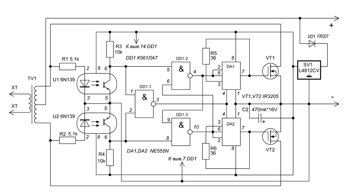 В качестве драйверов используется микросхема NE555. Она питается от источника напряжения 6-20В. На входах микросхемы стоят КМОП триггеры Шмита, а, следовательно, на выходе получаются крутые фронты импульсов, даже при медленно меняющихся сигналах на входе. Выходной ток микросхемы достигает 0.2А, что позволяет управлять мощными полевыми транзисторами. Работает синхронный выпрямитель следующим образом. Пусть на стоке транзистора VT1 действует положительная полуволна (полупериод). На диоде оптрона U1 будет положительное напряжение 0,7В и он излучает свет, который открывает транзистор этого оптрона. Это приводит к появлению на выводе 2 драйвера DA1 высокого уровня напряжения а, следовательно, и на выходе его будет низкий уровень напряжения. Транзистор закрыт (заметим, что его диод открывается отрицательной полуволной). Пусть на стоке транзистора VT1 действует отрицательная полуволна напряжения. Открывается обратный диод транзистора. Диод оптрона не излучает свет и его транзистор закрыт. Таким образом, на входе логического элемента DD1.2 (выв.5) присутствует высокий уровень. Транзистор VT1 открывается. Работа второго канала аналогична работе первого.