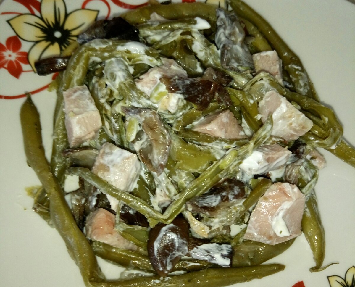 Блюдо простое в исполнении, белковое, сытное, но диетическое. Такое блюдо прекрасно подойдет для ужина. Оно не требует гарнира. Стручковая фасоль очень полезна, она содержит белок, клетчатку и массу полезных веществ. Нежирная свинина и грибы тоже содержат много белка, который позволяет хорошо насытиться организму и не кусочничать до завтрака следующего дня. Рецепт блюда из стручковой фасоли. Нам понадобится: Фасоль стручковая замороженная Свинина не жирная отварная Грибы Лук репчатый Чеснок Сметана или сливки 10% Масло растительное для обжарки Соль, специи. Берем продукты в произвольном количестве. Если свинина сырая, можно ее нарезать мелкими кубиками и потушить предварительно. На сухую сковороду кладем грибы и выпариваем влагу, наливаем немного растительного масла и кладем к грибам лук, нарезанный мелким кубиком, обжариваем до готовности. Убираем со сковороды грибы с луком. Кладем на эту же сковороду фасоль стручковую и обжариваем до готовности. К готовой фасоли добавляем нарезанну