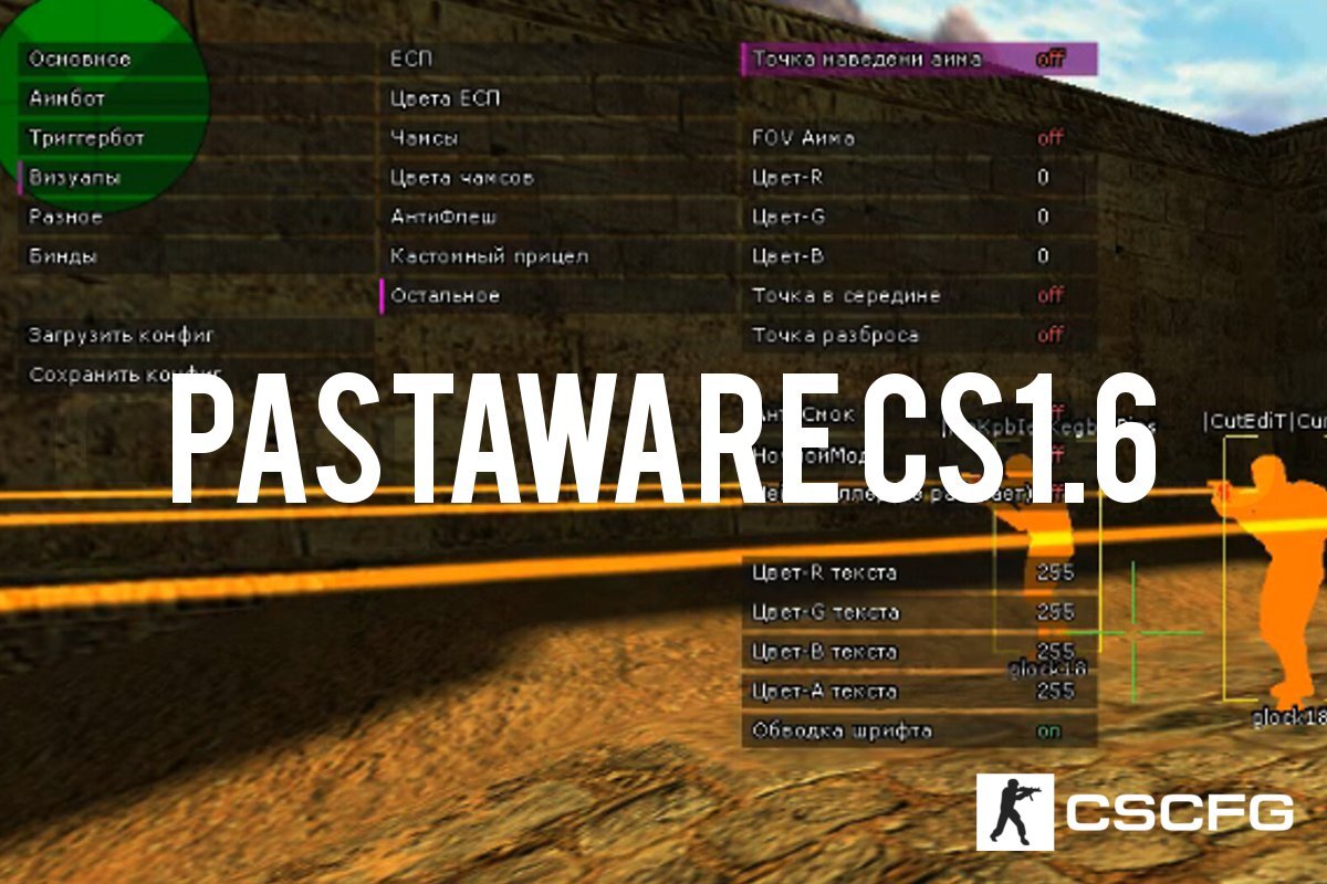 Бесплатный чит для CS1.6, который работает на все 100% - это PastaWare для кс 1.6, с ним Вам будет не страшно играть на серверах, он беспалевный. Одна из главных особенностей заключается в том, что он полностью переведен на русский язык, то есть меню полностью русское. В нём имеются много различных функций, но главные - это AimBot, WallHack и SpeedHack. Кадая из функций имеет собственные настройки, которые Вы сможете подогнать под себя. Скачивайте новый чит PastaWare для кс 1.6 - аим, вх, спидхак и занимайте топы на любых серверах! Скачать PastaWare для кс 1.6 можно по ссылке.