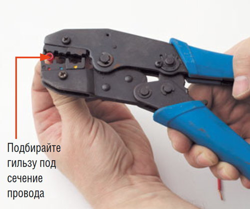 Соединение проводов опрессовкой гильзами проводится весьма быстро, к тому же получается изолированным. В практике домашних мастеров встречается редко, в отличие от автоэлектриков. Гильзы подбирают из расчета сечения соединяемых проводов. Инструменты и материалы для работы: клещи для обжимки гильз, гильзы. Соединение проводов обжимными гильзами Подготовьте гильзу под сечение провода. Разжимаем клещи и затем слегка сжимаем, чтобы ввести гильзу в место обжима, которое должно соответствовать диаметру гильзы. Обычно это маркируется цветом. Заранее зачистите провода от края на расстоянии 8 мм. Слегка зажимаем гильзу в клещах. Вставляем в нее провод. Смотрим, чтобы изоляция провода не попала в металлическую трубку гильзы, а сама оголенная часть провода не выступала за изоляционную часть гильзы. Делаем обжим гильзы. Наблюдаем, чтобы провод не вышел в это время из гильзы. Обжимаем второй провод в гильзе аналогичным образом. Проводим проверку, чтобы провод был зажат хорошо и не шатался в гильзе
