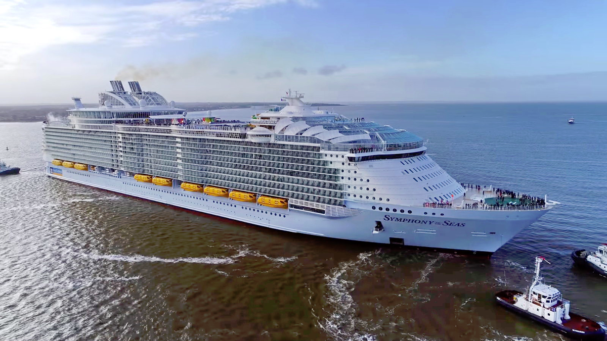 Новый лайнер "Симфония морей" - собственность американской круизной компании Royal Caribbean International. Он был спущен на воду в марте этого прошлого года и уже в апреле отправился в первую поездку. Это судно класса Oasis с 18 палубами и вместимостью 6680 человек. Во время круиза пассажирам некогда скучать: к их услугам аттракцион "зиплайн", ледовый каток, миниполе для гольфа, стены для скалолазания и даже генератор волн для серфинга. На борту лайнера 22 ресторана, более 40 баров и мест для отдыха. Есть даже заведение с футуристическим оформлением, где коктейли взбивают услужливые роботы. "Симфония морей" уже 25-е судно компании Royal Caribbean. Оно имеет длину 362 метра и ширину 65 метров. На строительство лайнера было потрачено 1,35 млрд долларов. "Симфонию морей" ее создатели называют "огромной игровой площадкой для гостей любого возраста". Там можно кататься на коньках, играть в гольф и баскетбол, заняться скалолазанием или серфингом. Есть даже аттракц