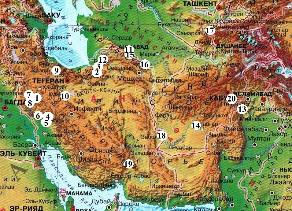 8. Тепе Гуран, (Tepe Guran, провинции Керманшах). Многослойное городище 6500-5500 лет до н.э.). Дома из овального сырцового кирпича, составные серпы, зернотёрки, расписная посуда и другие признаки оседлого земледелия – ок. 6200 г. до н.э.