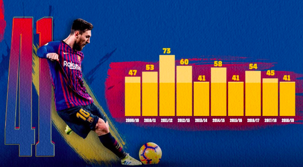 Нападающий «Барселоны» Лионель Месси сделал дубль в ворота «Эспаньола» (2:0) в 29-м туре Ла Лиги. 31-летний аргентинец забил 40-й и 41-й гол в сезоне во всех турнирах. Месси забивает как минимум 40 голов в 10 сезонах подряд. Фото из Инстаграмма Барселоны