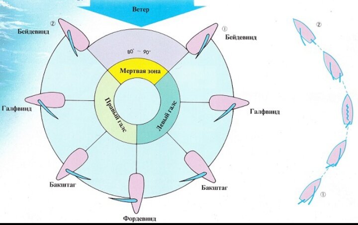 Передвижение парусной яхты по ветру фактически определяется простым давлением ветра на ее парус, толкающим судно вперед. Однако, как показали исследования в аэродинамической трубе, путешествие под парусом против ветра подвергает парус воздействию более сложного набора сил. Когда набегающий воздух обтекает вогнутую заднюю поверхность паруса, скорость воздуха уменьшается, в то время как при обтекании выпуклой передней поверхности паруса эта скорость растет. Вспомните урок "Почему при крученом ударе мяч летит по дуге". Здесь получается аналогичная ситуация. На задней поверхности паруса образуется область повышенного давления, а на передней — пониженного. Разность давлений на двух сторонах паруса создает тянущую (толкающую) силу, которая перемещает яхту вперед под углом к ветру. Парусная яхта, расположенная примерно под прямым углом к ветру (по морской терминологии — яхта идет галсом), быстро движется вперед. Парус подвергается воздействию тянущей и боковой сил. Если парусная яхта идет