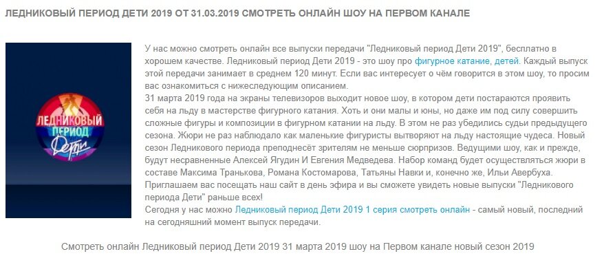 Сегодня на Первом канале стартовал Второй сезон шоу "Ледниковый период. Дети". В беседе с журналистами в утренней программе Максим Траньков в шутку назвал программу "Детским садом имени Ильи Авербуха". "Ледниковый период. Дети" это уникальный проект. В отличие от других программ с участием детей, здесь не только показывают талантливую поросль, но и учат - практически в прямом эфире. Организаторы говорили, что многие ребята приезжают на съемки из глубинки, из регионов России. Там мало катков, мало возможностей для полноценных тренировок. Для этих ребят съемки в проекте с Олимпийскими чемпионами - своеобразные сборы, возможность погрузиться в профессию. Ведущей шоу с Алексеем Ягудиным стала Алла Михеева, российская актриса и телеведущая. Многие ждали Евгению Медведеву в этой роли, так и анонсы писали о ее участии. Но причин ее отсутствия я в сети не нашла. Вероятно, съемки начались задолго до премьеры, и в это время фигуристка принимала участие в Чемпионате мира-2019. Хотя, уже ведущие г