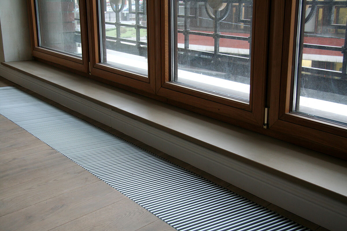 Встраиваемые в пол конвекторы появились из потребности отапливать помещения с панорамными окнами. Кафе, магазины, офисы, торговые центры, выставочные залы — панорамное остекление используется практически везде. В 2019 большое число элитной жилой недвижимости строится с окнами в пол.