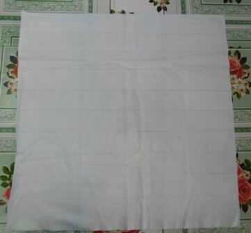 Подушка в стиле «Пэчворк» - это мой очередной эксперимент. Я хочу поделиться с вами своим опытом. Размер своей подушки я выбрала 50х50 см. плюс припуски на швы примерно по 2 см со всех четырех сторон. Моя подушка будет состоять из двух половинок: передняя – в стиле «Пэчворк», сделанная на белой однотонной ткани и задняя – декоративная ткань (плотная скатёрочная). Я решила сделать ее в цветах радуги. Для подушки я сшила много пятиугольников разных цветов. Как шить пятиугольники смотрите МК «Чехол для пуфика». 1. Для начала я произвела расчет – сколько примерно нужно пятиугольников каждого цвета. Выкладываем лепестки сначала по ширине. В один ряд у меня уместилось 14 штук. В следующем ряду должно быть на 1 больше для симметрии, чтобы перекрыть края. 2. На ткани я нарисовала параллельные линии через каждые 5 см. Они будут помогать мне, не потерять ровный ряд, чтобы узор не перекосило. Так сказать, послужат мне направляющими линиями. 3. Считаем количество рядов, которое поместиться на