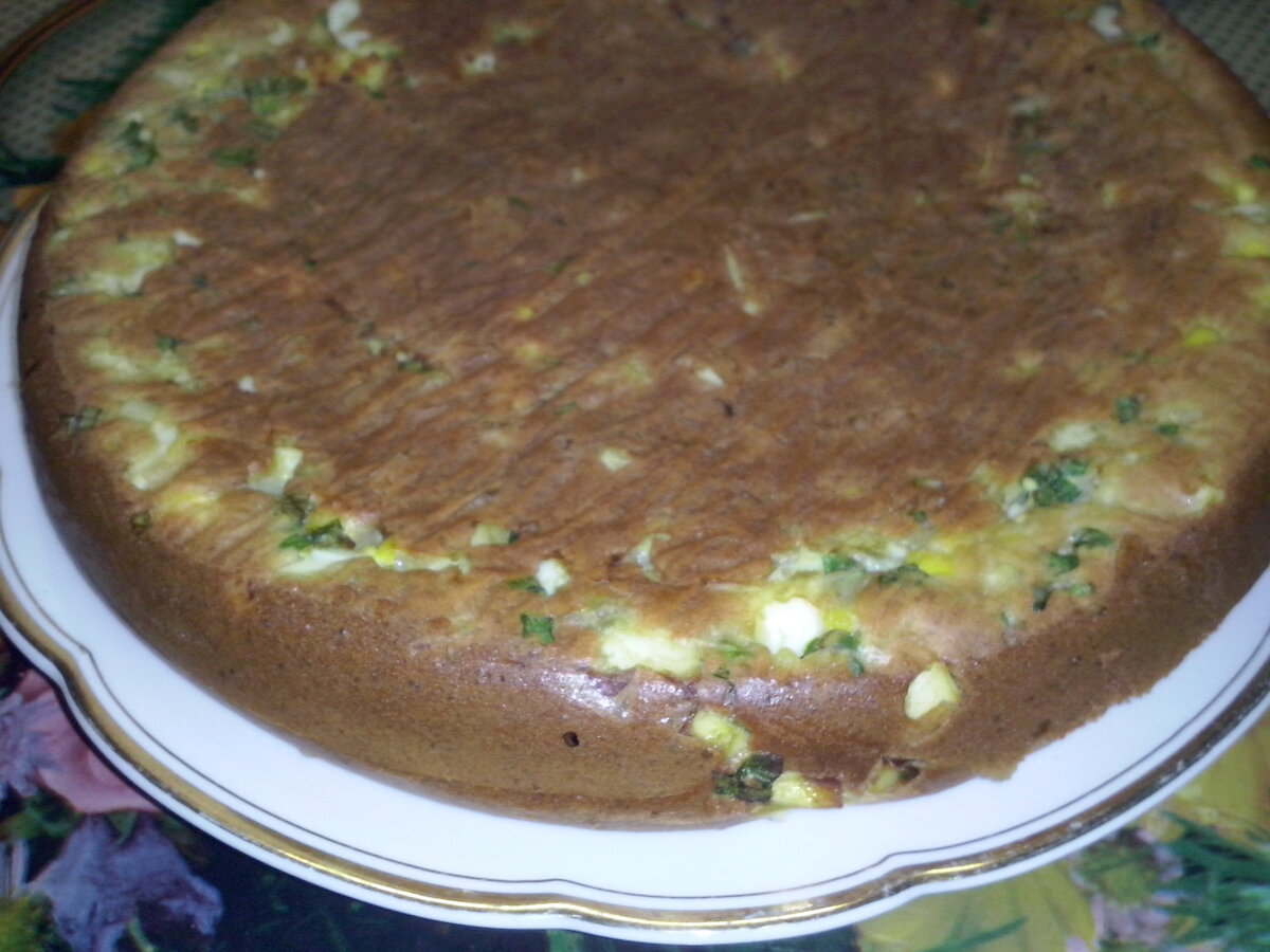 - выпекаем в духовке на небольшом огне примерно полчаса, за это время пирог поднимется и зарумянится (готовность определяем зубочисткой, если тесто не липнет - пирог готов)