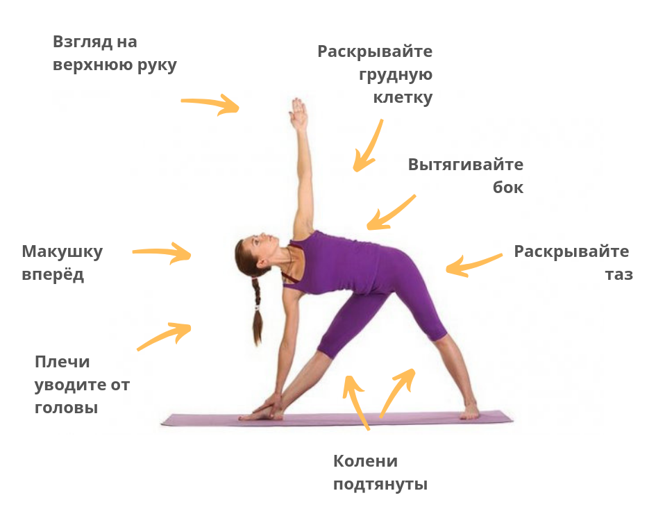 Привет, йоги! Давайте рассмотрим две часто практикуемые позы йоги. А также на что следует обратить внимание во время практики. Уттхита Триконасана Поза треугольника или Уттхита Триконасана. Поза вроде бы и не сложная, но при выполнении нужно отслеживать работу всего тела: ног, плеч, шеи и т.д. Не старайтесь обязательно поставить ладонь на пол, если при этом вы начинаете заваливаться вперед и ваша спина округляется. Лучше используйте кирпич или ставьте ладонь на голень. Не забывайте дышать! Сукхасана Легкая поза или Сукхасана. Эта поза сидя на самом деле не так проста, как может показаться. Ключ к тому, чтобы долго и эффективно сидеть - это найти равновесие. Для начала убедитесь, что ваши седалищные кости плотно прижаты к коврику. Если вам неудобно, сядьте на согнутое одеяло. Удлиняйте спину и тянитесь макушкой головы к небу. Расслабьте плечи и закройте глаза. Наконец, положите руки на колени ладонями вверх. В этой позе самое сложное - оставаться неподвижным. Посмотрите, сможете ли в