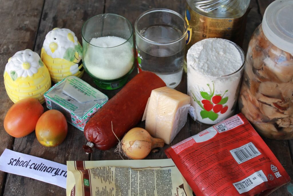 Пиццу с колбасой и грибами вкусно съесть вместе с чаем или предложить в качестве второго блюда. Она самодостаточна, сочна и очень вкусна. Палитра начинки покоряет разнообразием и гармонией компонентов. Грибочки, колбаска, лук и помидоры вместе с сыром понравятся всем, кто любит сытно поесть в кругу родных и друзей. Даже на второй день такую пиццу можно взять с собой на работу, чтобы плотно пообедать, не выходя из кабинета. Ингредиенты: Приготовление В теплой воде размешиваем дрожжи и сахар. Через 20 минут смесь, подошедшую шапочкой, выливаем в просеянную пшеничную муку. Добавляем соль и замешиваем тесто, которое будет слегка липнуть к рукам. Собираем его в ком и даем минут 20 отдохнуть под льняным полотенцем при комнатной температуре. Готовое тесто выкладываем в противень, смазанный растительным маслом. Руки также нужно смазать маслом. Тогда будет легко распределить тесто по противню. Делать это нужно постукивающими движениями, как бы растягивая тесто в разные стороны. Готовую основу