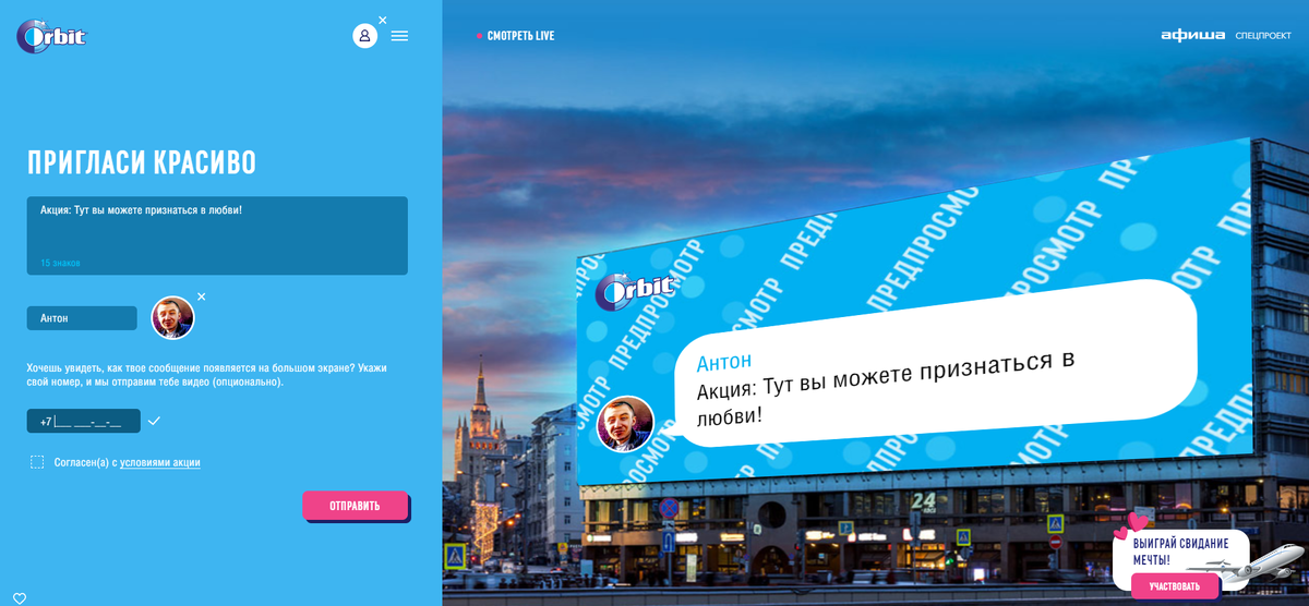 Orbit совместно с Афишей запустил забавную акцию. Вам нужно написать сообщение с признанием в любви или приглашением на свидание на промо-сайте, и оно появится на большом экране в центре Москвы по адресу Новый Арбат, 2. Если указать свой телефон, то вам даже пришлют видео с выходом вашего сообщения. Это не шутка, и на сайте можно посмотреть даже прямую трансляцию этих сообщений. Офф Сайт: http://69w.ru/43