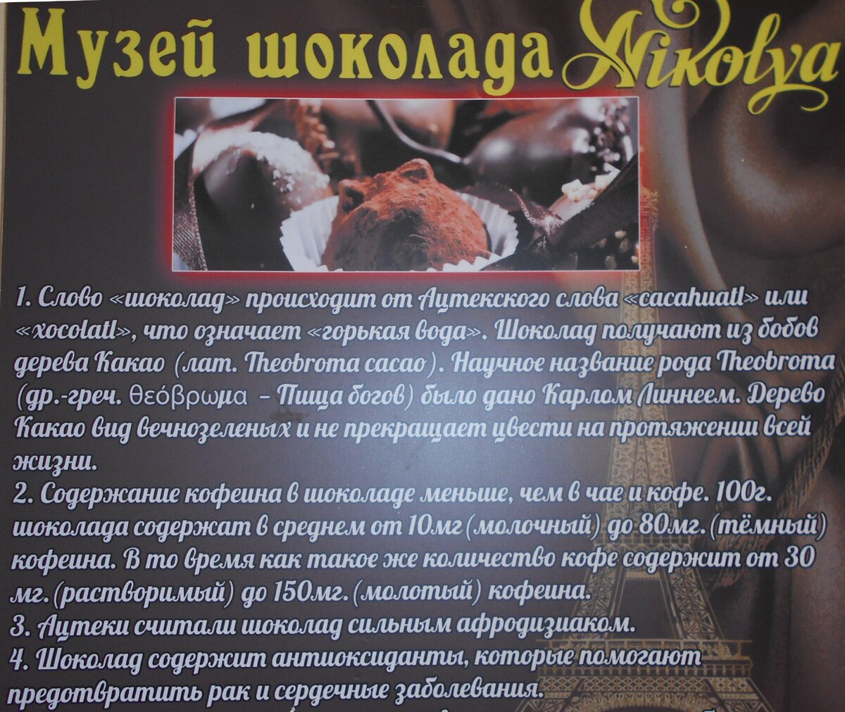 В преддверии Дня всех влюбленных мы посетили музей шоколада. Выставка музея шоколада Nikolya путешествует по разным городам и странам мира. Этот музей открыл в Симферополе крымский шоколатье Николай Попов. Технике работы с шоколадом Николай обучался в академиях Польши и Франции и получил специальность шоколатье. Выставка музея шоколада не только разжигает аппетит, но и поражает воображение великолепными изделиями, выполненными полностью из шоколада. Визитная карточка передвижного проекта - шоколадная Эйфелева башня. Венецианские маски - традиционный символ ежегодного венецианского карнавала. Ими пользовались и в повседневной жизни. Это служило разнообразным целям: от романтических свиданий до совершения преступлений. Позднее это привело к запрету ношения масок вне карнавала. Шоколадная пена для ванны.