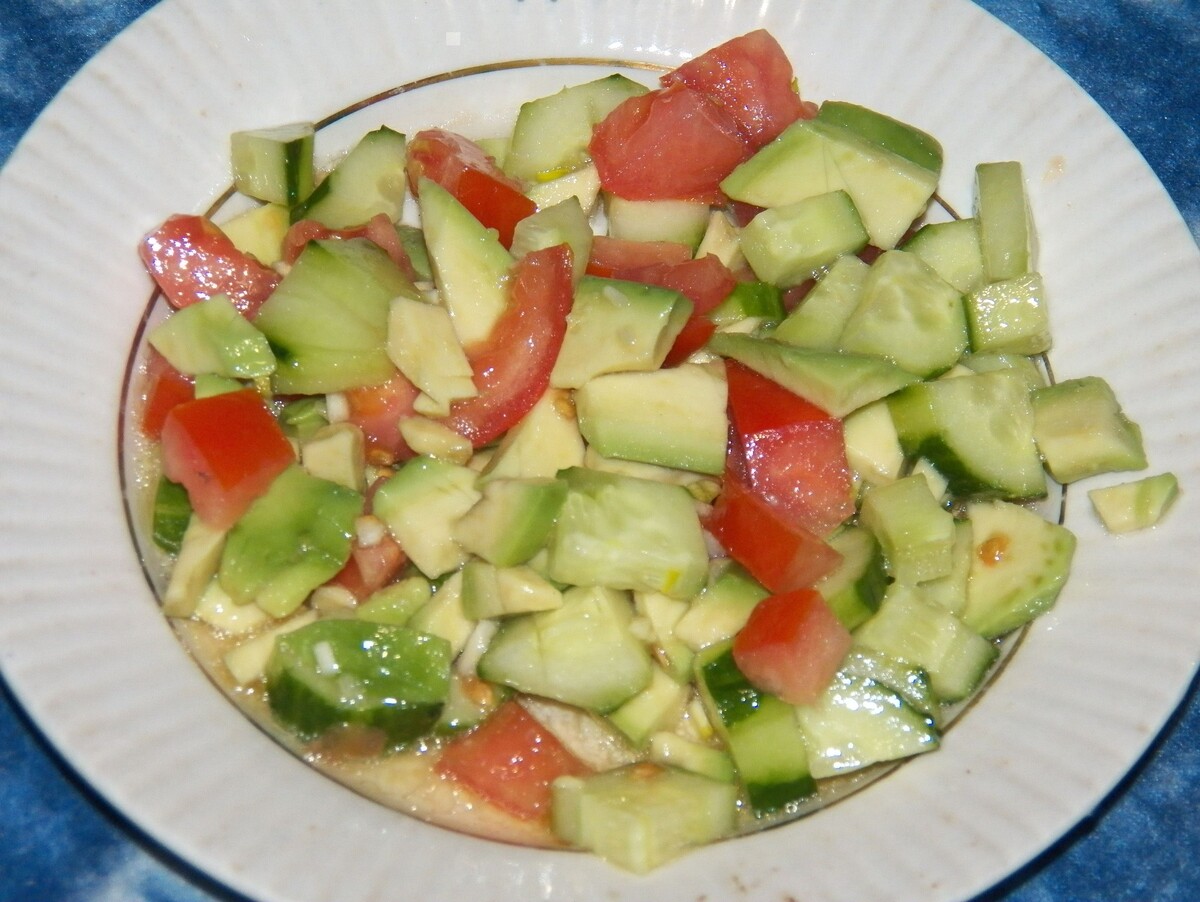 Этот яркий освежающий весенний салатик настолько просто, что не высказать и не вышептать! Его можно употреблять как днём, так и вечером и даже после захода солнца на ночь без вреда для здоровья! Его обожают как веганы, так и обычноеды! Представляете! ;) Ингредиенты: 1. Огурец 2. Помидоры 3. Авокадо 4. Льняное масло (холодного отжима) 5. Перец (черный или красный) 6. Чеснок (не обязательно) Способ приготовления проще пареной репы! Нарезаем кубиками огурец, помидоры и авокадо, заливаем маслицем, посыпаем перчиком и чесночком. И вперёд с песней! Получаете лёгкость от огурцов, а сытость от авокадо и масла ! Вообще, часто в интернете пишут, что помидоры и огурцы лучше не смешивать, так как помидоры являются окисляющим овощем, а огурцы выщелачивающим. Поэтому здесь на своё усмотрение использовать какой-то один ингредиент огурец или помидор или оба. Авокадо и льняное масло даёт Омега 3 жирные кислоты и насыщает организм. Масло лучше всегда использовать холодного отжима,потому что горячег